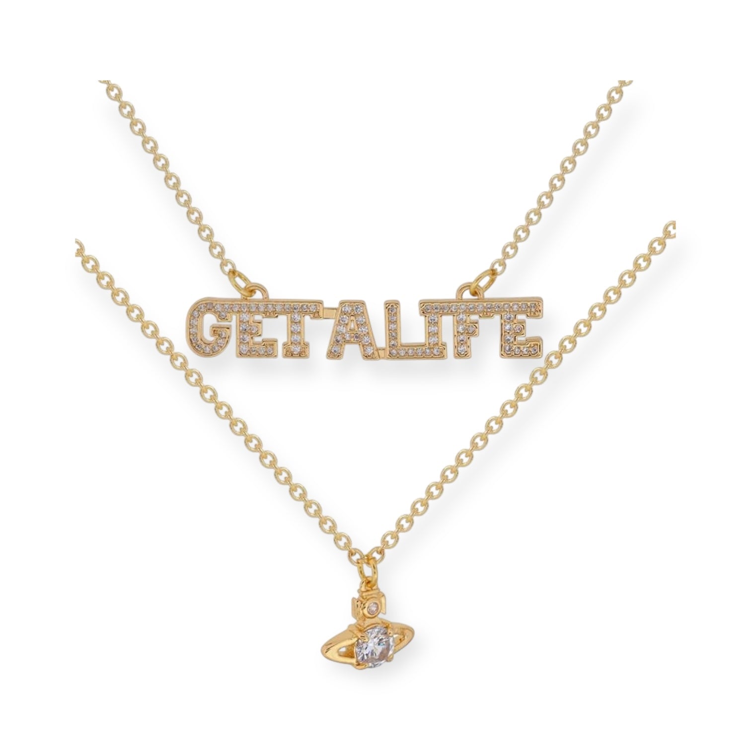 Double Chain Gem Studded "GET A LIFE" Pendant & Mini Orb Pendant Gold & Silver (2 Colors)