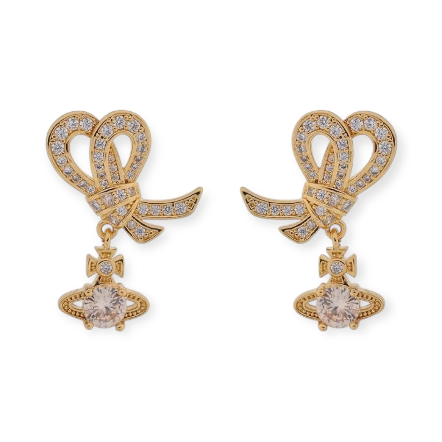 Gem Studded Bow Ribbon Mini Orb Hanging Pendant Gold & Silver Stud Earrings (2 Colors)